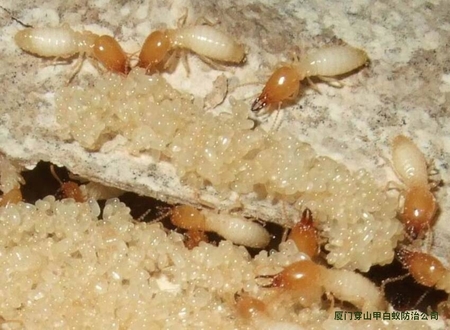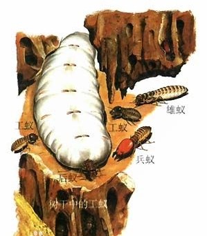 一巢成齡的臺灣乳白蟻,它們的成員有蟻皇、蟻后、兵蟻、工蟻。若蟻等。它們的結構式非常之嚴謹,品級分工清楚,蟻皇授精,蟻后產卵,兵蟻守衛(wèi),工蟻覓食勤務,若蟻待成熟長翅,分飛自立成巢。白蟻怕光,喜陰暗潮濕的環(huán)境。工蟻外出覓食,將食物消化轉換成養(yǎng)分,喂養(yǎng)巢內各品級白蟻,白蟻個體與個體之間營養(yǎng)均衡,相互清潔身體,相互撫慰,主要造成我們家居破壞的是工蟻——“破壞王”,它們尋找食物的半徑約100米。